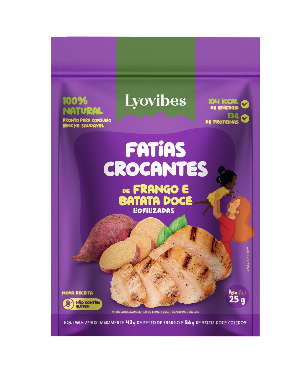 Peso líquido: 25g. Fatias de Frango com Batata Doce Liofilizadas Lyovibes – Sachê 25g Snack proteico, saudável e crocante, sem conservantes! Destaques do produto:
